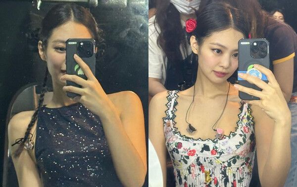 사진 속 제니는 공연을 위해 치장한 모습을 거울 셀카로 담아냈다.